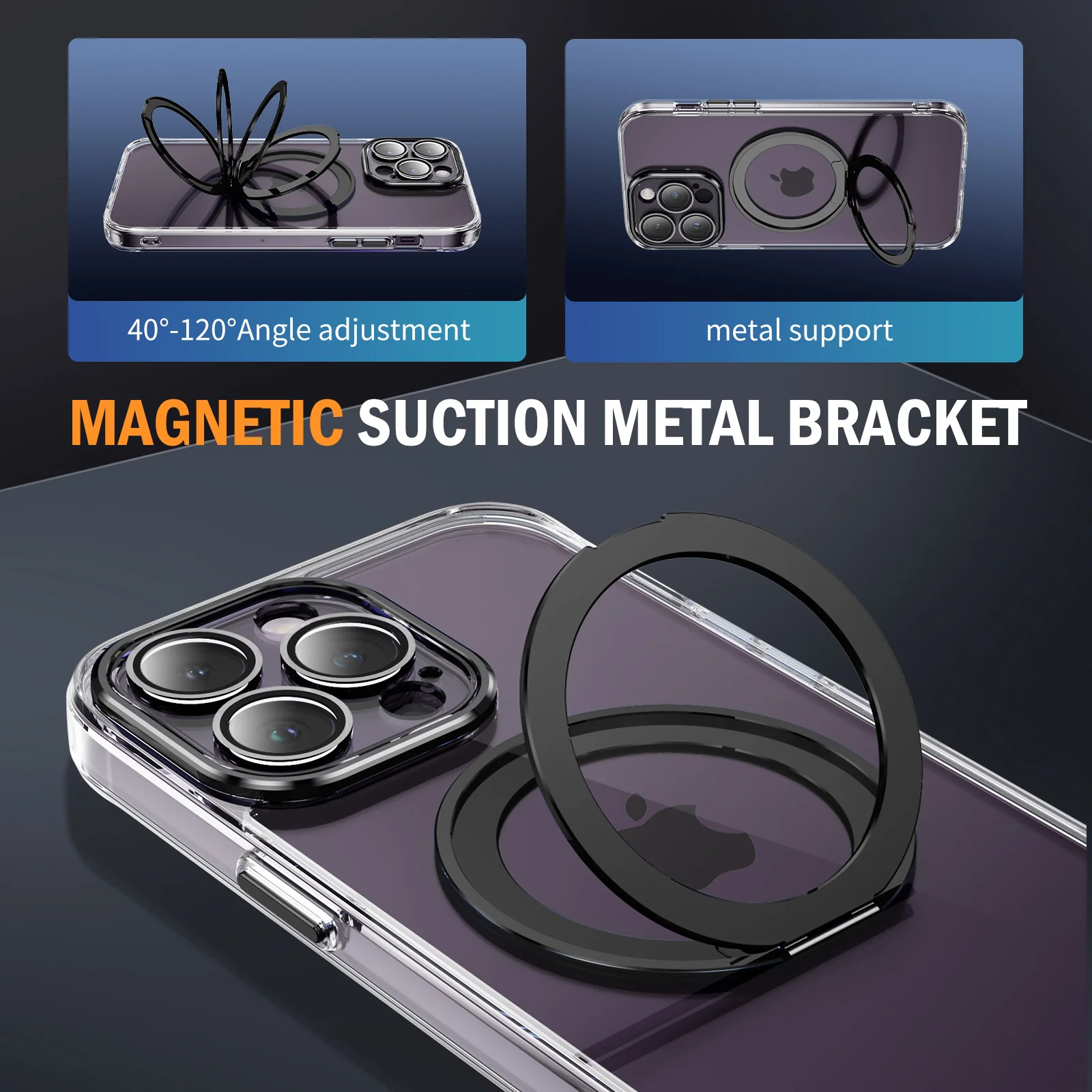 A transparent, durable case featuring strong MagSafe support, camera lens protection, and a built-in stand for hands-free viewing.